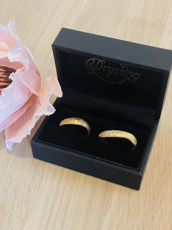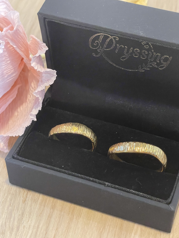Ringene er udført i 14 kt guld med en rillet overflade, som giver dem et anderledes look.