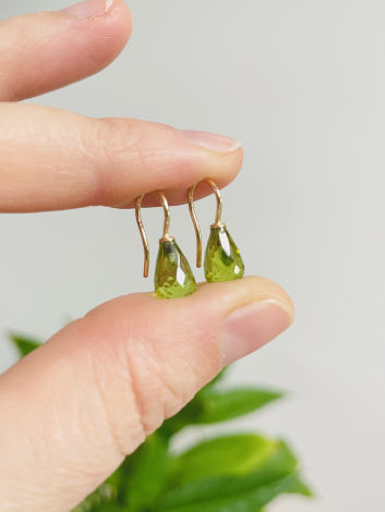 Et sæt fine og enkle 14 kt guldørekroge med lysegrønne peridoter.
