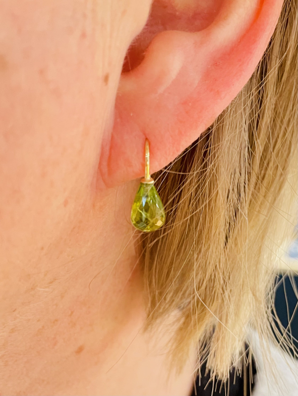 Ørekrogene sidder flot på øret, så peridot dråben hænger frit under øreflippen.