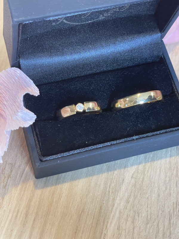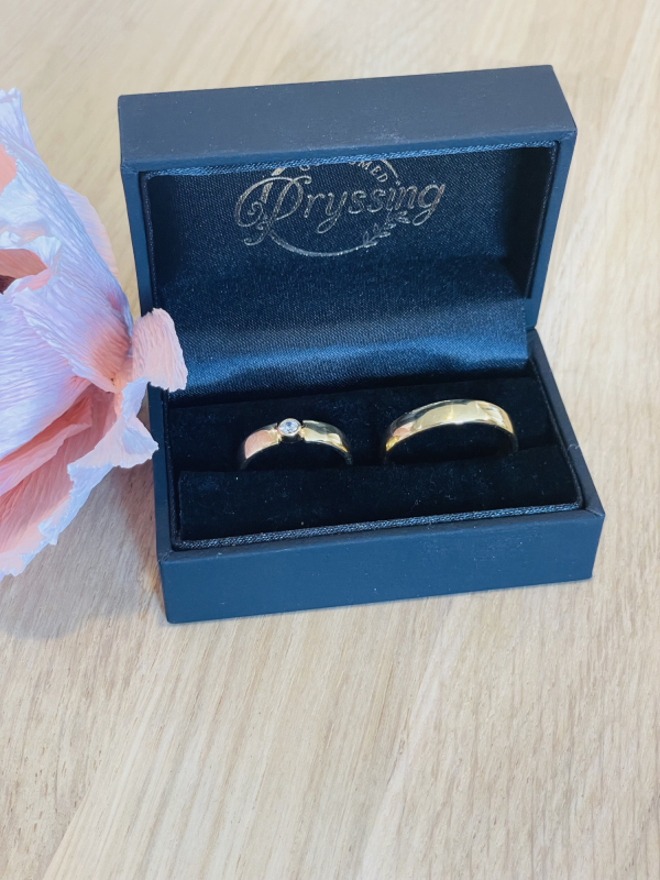 Ringene er udført i 14 kt guld. Selve ringskinnen måler 1,5 mm i tykkelsen, og har en let afrundet form udenpå og indvendigt, som gør den meget behagelig at have på.