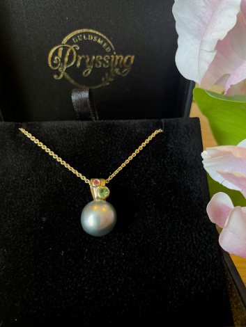 Denne smukke lysegrå Tahitiperle er monteret på et kraftigt 14 kt guld patzøsken. Overfladen på patzøsknet er let matteret, med nogle enkelte blankpolerede detaljer. På patzøsknet er der loddet to guldkugler, hvori der er indfattet to funklende turmaliner, én pink turmalin på 1,6 mm i diameter, og en grøn turmalin på 2,9 mm i diamter. De danner en flot harmoni med den lysegrå Tahitiperle.