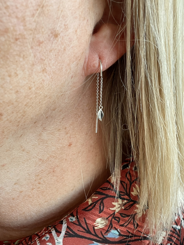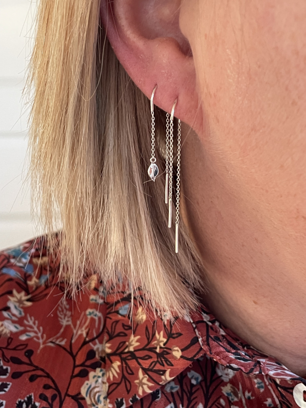 Enkle og fine håndlavede øreringe med kædestykker, som hænger ned både foran og bagved øret. På den korteste kæde sidder en lille blankt sølv blad og skinner.