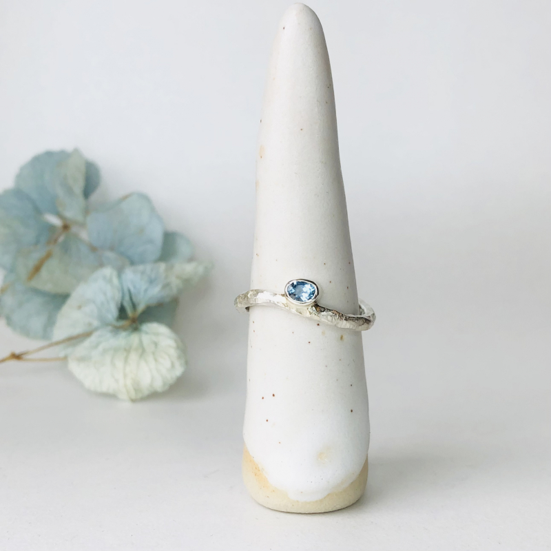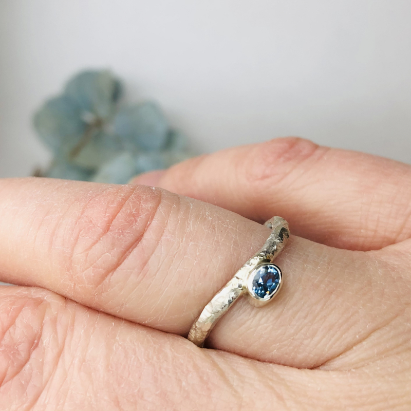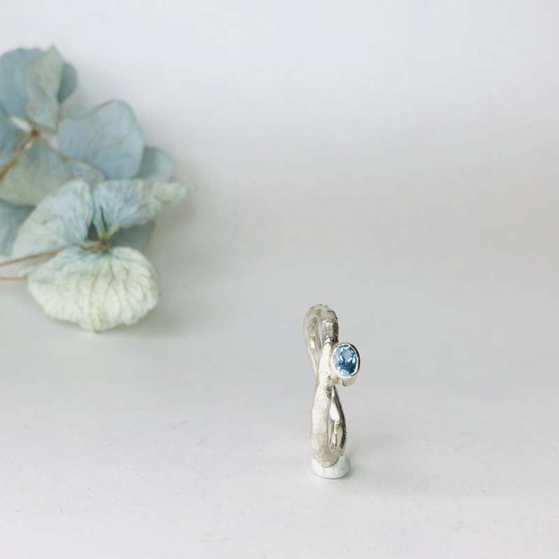 Denne bølgende sølvring med en oval havblå Aquamarin på siden, har jeg givet en rustik overflade, for at symbolisere havets vilde natur.