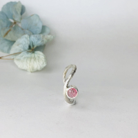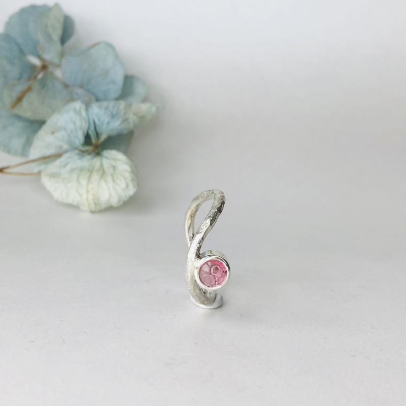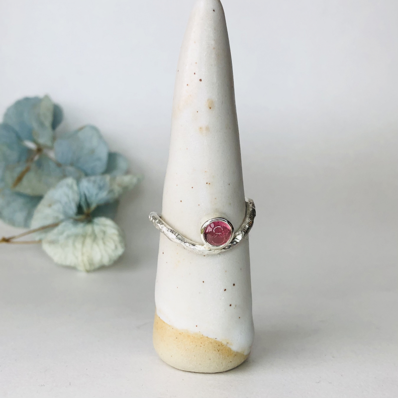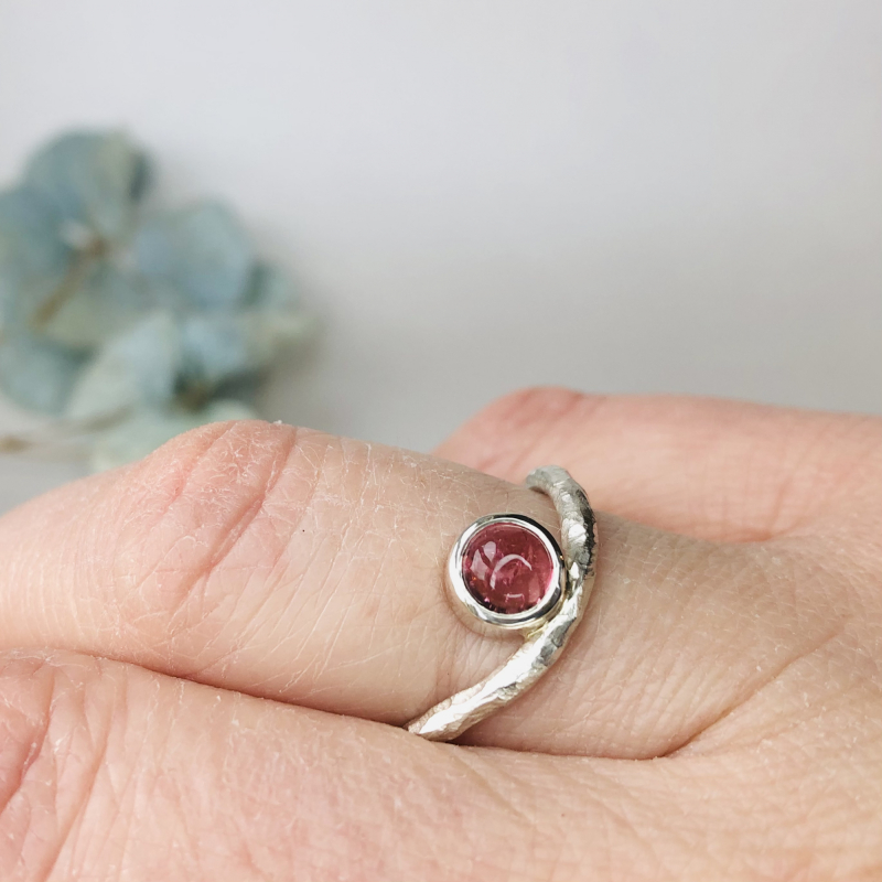 En smuk bølgende sølvring med en rund cabochonslebet pink turmalin. Ringskinnen har en rustik overflade, som giver ringen et råt look.