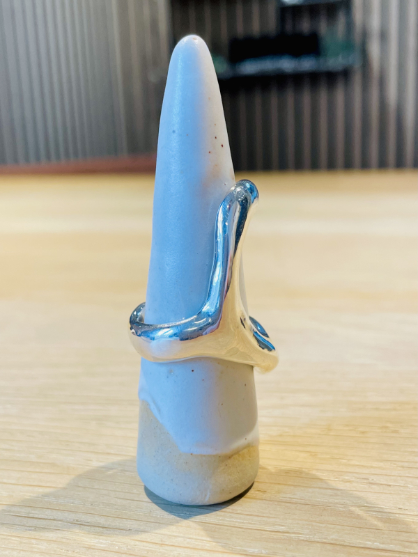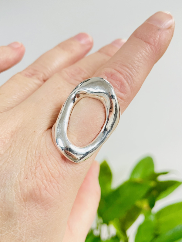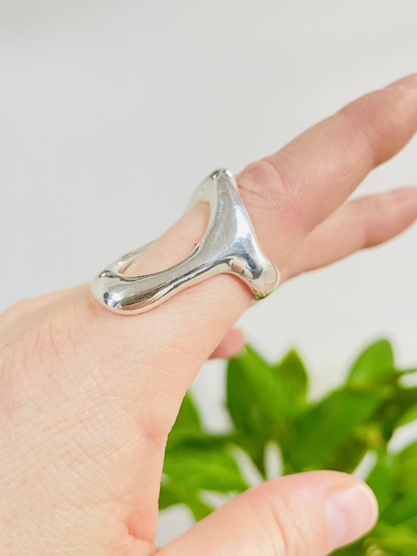 Ringen er stor og fyldig, og fylder godt på fingeren. Den har organiske og bløde former, hvilket gør ringen yderst behagelig at have på. Ringen er blankpoleret på hele overfladen.