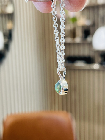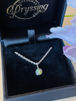 Lille fint vedhæng med smuk opal fra Mexico. Opalen er dyb og mørk i farven, men fuld af ild og liv. Opalen måler ca. 5 mm i diameter.